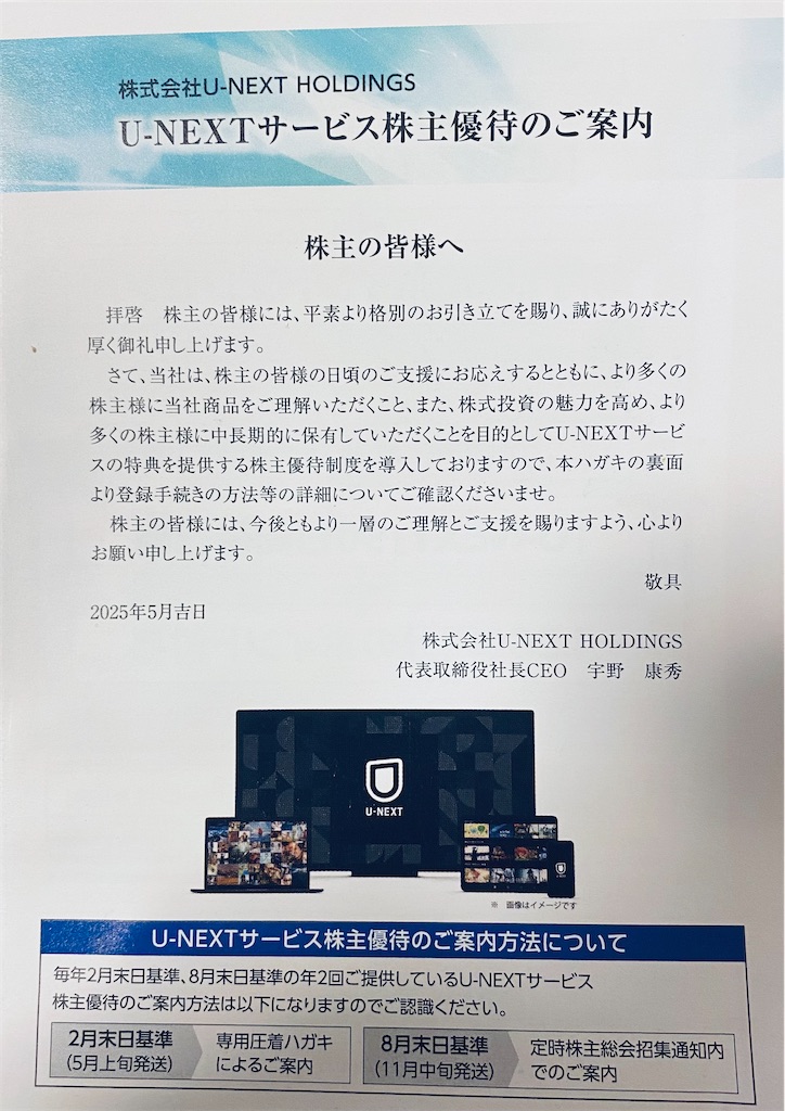 U-NEXT HOLDINGS[9418]より株主優待案内をいただきました。3,000株保有しています。去年の12月に3分割しています。PBR4.19倍、予想配当利回り0.66%(2025年5月18日現在)。米ワーナー・ブラザーズ・ディスカバリーの動画配信サービス「MAX」の日本独占配信権を獲得しています。その為「ハリーポッターシリーズ」などを追加料金なしで楽しめるようになりました。有料会員数は24年5月時点で国内430万人に到達し国内定額動画配信サービスでネットフリックスに次ぐ地位を獲得しています。1~2年以内に会員数500万人を突破し3~5年後には独自作品を継続的に世界に発信出来る体制をつくると話していたとの事。国内飲食業向けPOSサービスなどから家賃保証サービスまで手広く手掛ける会社ですが今後の発展にも目が離せなくなってきましたね。